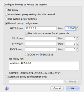The Privoxy service responded on the other side so let’s configure Firefox to use this newly created socket as an HTTP proxy.