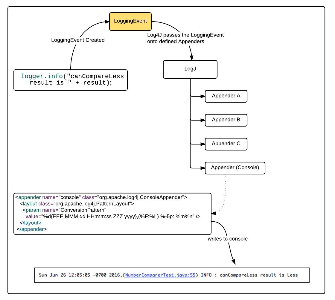The benefit of using Appenders in Log4J is that log entry behavior is separated from log reporting behavior. A programmer decides what needs to be logged. A System Admin responsible for the operation of the application in production can add, remove and modify Appenders to meet the needs at hand. Thus, as shown in Figure 1 above, you can see that the System Admin configured a Console Appender to make a log entry according to the following Conversion Pattern definition: