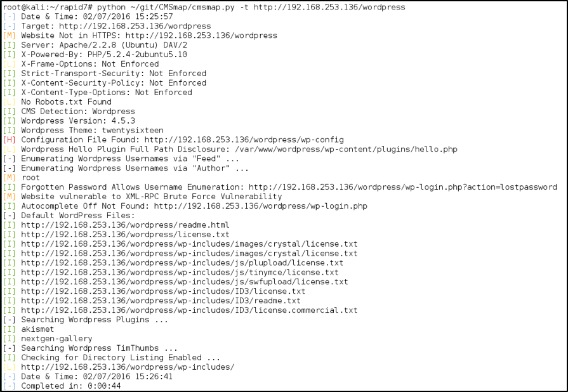 If there is a content management system (CMS) running, you might want to get a better idea of what its running with a tool like CMSmap, or WPScan (if running WordPress) or Droopescan (if running Drupal). With a little searching, you can probably find a tool for whatever CMS the site may be running. In the figure below, we are running CMSmap against a Wordpress site, to get a better idea of which themes and plugins are installed.