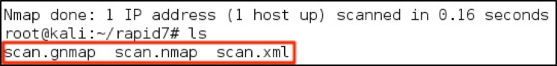 Use the –oA flag to tell nmap to output the results to all possible file types, using the string after (in this case, “scan”) as the file name. The file types that will be created are a greppable nmap file, an exact replica of the output we see above, and an xml file.