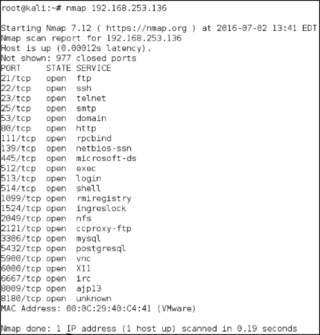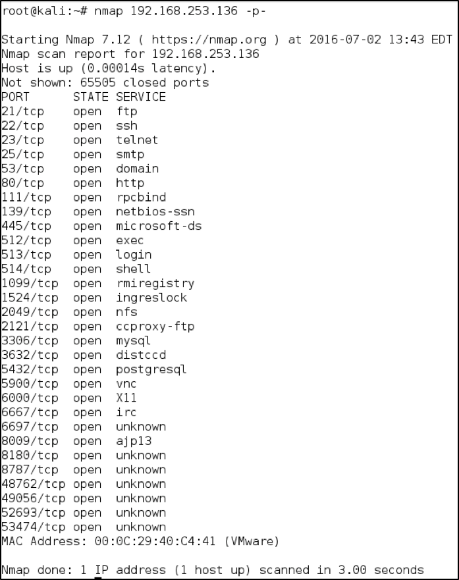 We may also want to check all 65,535 available ports on a machine, to see if it is using any uncommon or non-standard ports. This can by done by adding the “-p” flag. You can either indicate all ports with “-p 0-65535” or more simply just “-p-“.
