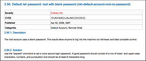 In the figure below, we see one example of the type of information that is gained from the Nexpose scanner. Nexpose is reporting that rsh is enabled on the server and the root account doesn't have a password at all! We can also see that the Nexpose vulnerability scanner is offering a solution. It gives an explanation of how to mitigate this confirmed vulnerability using the “passwd” command. Nexpose will give this kind of information, including its severity level, for each vulnerability it finds.