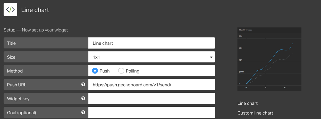 Note: To get the push URL for your custom widget, in the Geckoboard UI go to edit page of your widget and click “Push” in the “Method” section. You can also get the push URL during the creation of a widget.