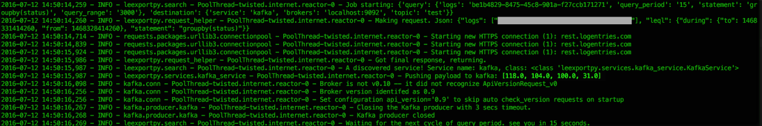 Leexportpy provides easy to use support for appending transformed Logentries statistics data to a Kafka topic. The current implementation of the Kafka Service is a great reference for showing the querying, transformation and export of Logentries data to a Kafka topic using Leexportpy. The data extracted from Logentries is based on querying your log data using a LEQL query, the results, which are either time series, or groupby statistics is then appended to Kafka topic. The structure of the service and the destination configuration represents what a typical Leexportpy Kafka service should look like.