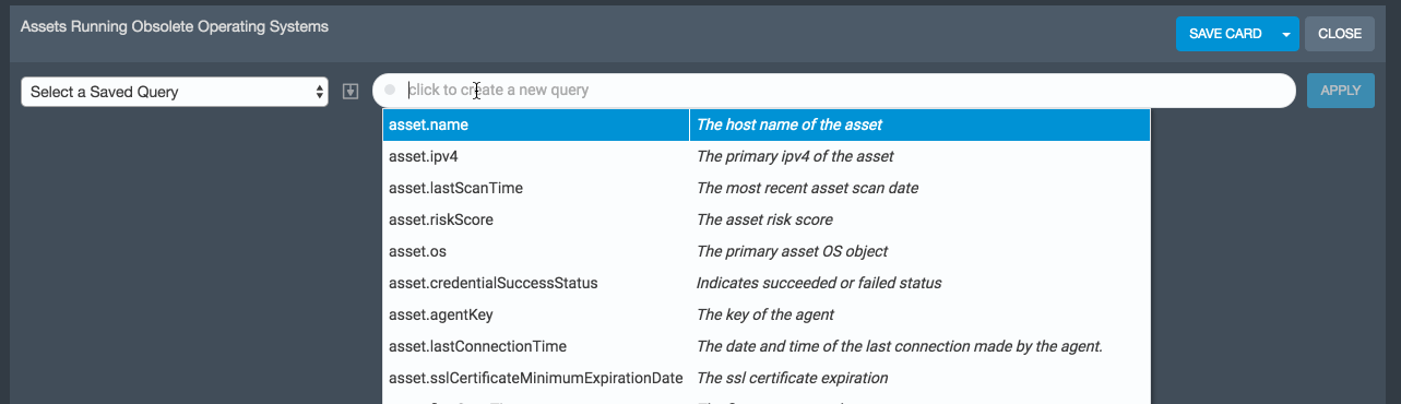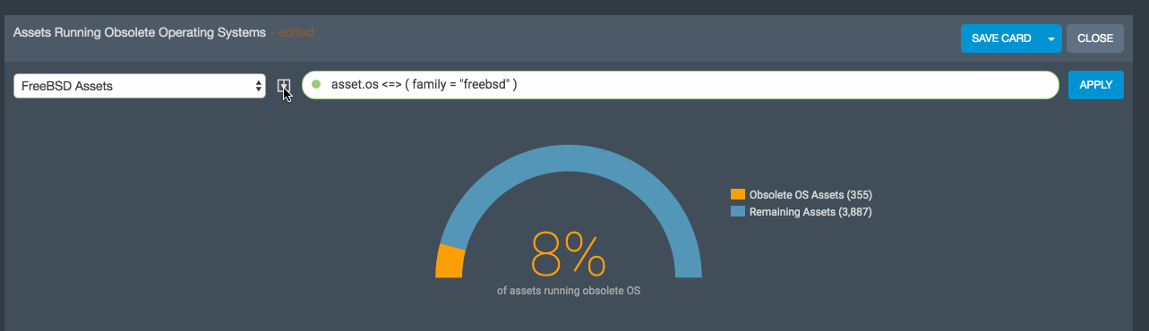 That query looks useful! Since you've spent time crafting it, maybe you want to save it and use it again later? Here I show how to save a query called "FreeBSD Assets" and then create a copy of the Assets Running Obsolete OS Card but only for FreeBSD Assets.