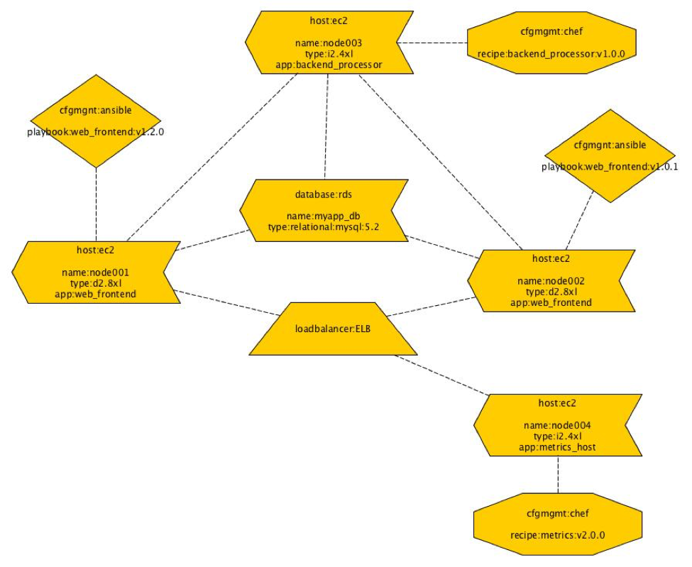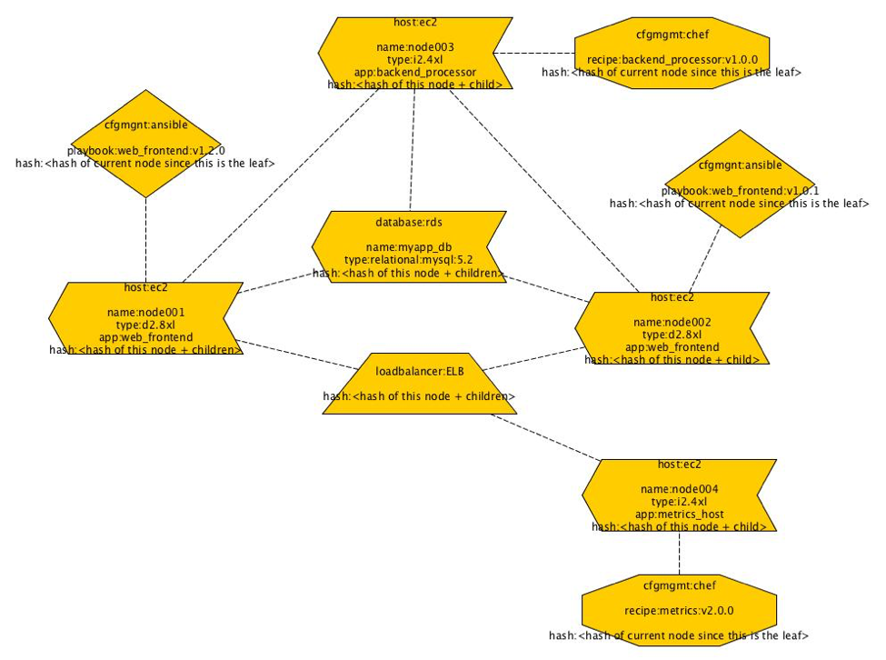 If the process of recreating a system is already repeatable with a combination of tools and configurations then why do we want to hash the configurations? At first, it is simply to be able to validate the reproducibility of the infrastructure. Questions such as how are scaling groups and load balancers related to a group of hosts, how are different services related, what is the shape of the network and the security groups that are in place, how are all these things interconnected? By having this output that can be validated as reproducible, it may be possible to track behavior and changes over time.