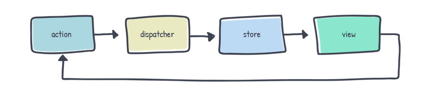 The flowchart (fluxogram) shows us views, stories, dispatchers and actions. User interacts with views (components) that dispatch actions (small functions with single responsibility) which updates the stores and, finally, render the views. Although, It seems a bit awkward in the beginning, you make your app more predictable. Consequently, more maintainable and easy to test.