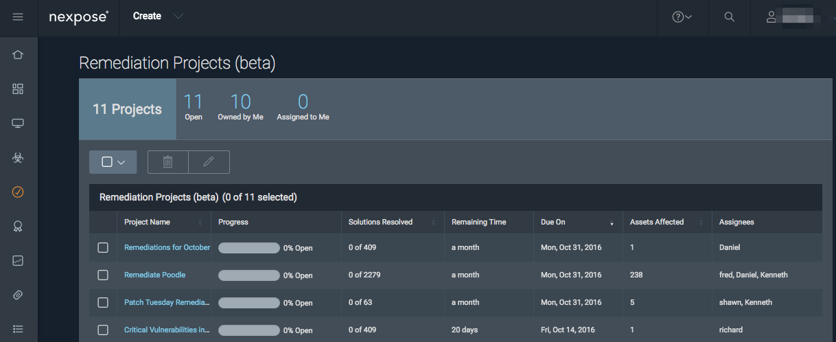 To start using Remediation Workflow, simply log in to Nexpose and opt-in to Nexpose Now. If you have already opted in to Nexpose Now, you'll automatically see the Projects icon appear in the left navigation menu.