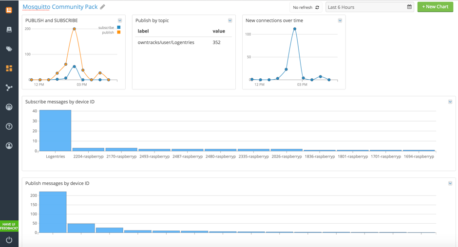 In order to make the analysis of Mosquitto logs easier, we’ve developed a Mosquitto Community pack that can be installed from your Logentries dashboard. This Community Pack is equipped with alerts such as: