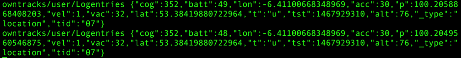 mosquitto_sub –h 10.0.0.5 –p 8883 –v –t ‘owntracks/#’ > /home/pi/Desktop/messages.txt