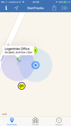 We now have OwnTracks connected to our Raspberry Pi using Mosquitto, so let’s set it up with Logentries to store all data collected and analyze sensor information. Just to give you a better idea of what can be achieved by combining OwnTracks native functionality and Logentries log analysis capabilities, we’ve configured a sample region in the application, and set its radius to 10 meters: