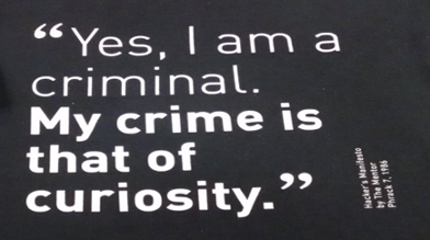 A few months before the CFAA originally passed, the e-zine Phrack published the The Hacker Manifesto, in which The Mentor explained to the world his crime: curiosity. The Mentor, a hacker affiliated with the Legion of Doom, celebrated exploring and outsmarting, discovering a “door opened to a world” beyond the mendacity of the day-to-day.
