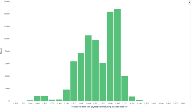 Based on service responses to probes on 389/udp it would appear CLDAP does provide a significant amplification source. The UDP datagram probe that was used in the study was roughly 51 bytes. Most of the valid LDAP responses without the headers ranged from 1,700 to 3,500 bytes. There were a few outliers in the 5,000 to 17,700 range. The chart below shows the response size distribution with the larger outliers removed.