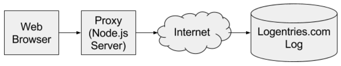 The architecture is straightforward. The client will send log data to a web server over a pre-configured route. The server will read the proper log token from a secure file. Finally, the server will forward all data from the pre-configured route to Logentries.com using the loaded log token.