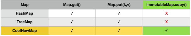 While CoolNewMap is free to implement both Map and ImmutableMap, a receiver taking Map as an argument can’t accept it. Even the ImmutableMap interface directly extends Map, we can’t leverage the extra methods in code that looks for Map without narrowing the signature to ImmutableMap (or casting, but let’s pretend we can’t do that for now). Additionally, we can’t make HashMap and TreeMap implement the new interface because even though they’re non-final, we don’t have control over the code. You probably come across this all the time- for example, say we have a database client from a vendor which implements IDBClient: