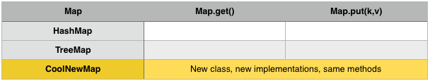 A receiving method which takes type Map doesn’t have to concern itself with the different implementation details of a HashMap or TreeMap; it’s enough to rely on the fact that both concrete types support the get() and put(k, v) methods. If we subsequently want to use a new Map implementation, CoolNewMap, we can do this without making any code changes. Aggregating behavior across concrete types like this is commonplace in the Java / C# world: