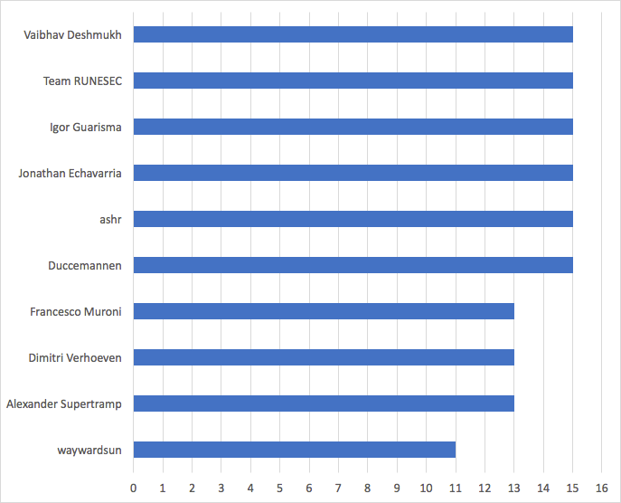 When we announced the competition, we didn't specify if team submissions were allowed or not. Well, it turns out that a team was in the top 3. Team RUNESEC went bonkers and submitted all 15 flags over the course of 4 days. Nice work RUNESEC. We didn't want anyone to feel slighted so we decided to go ahead and (in the spirit of the season) be generous 🙂. Therefore, Team RUNESEC will receive a 2nd place prize as they were second to submit all the flags. Additionally, the Top-3 individual submitters will receive prizes.