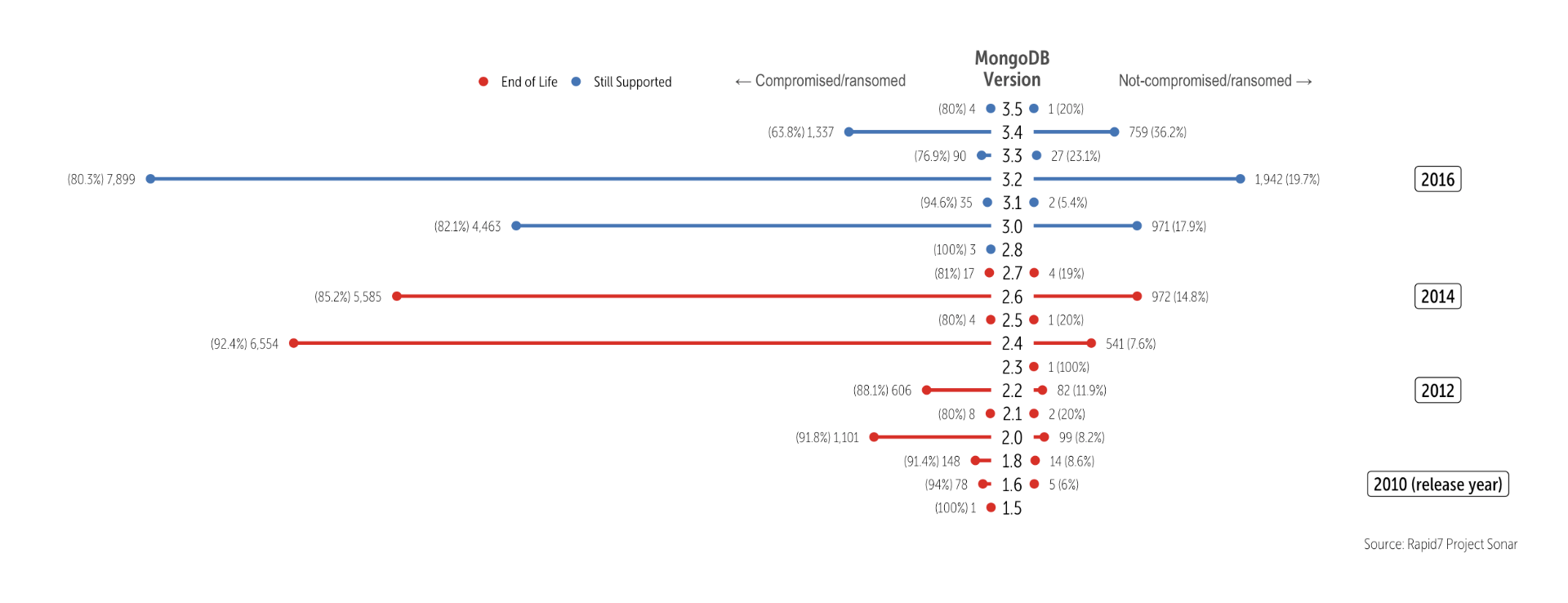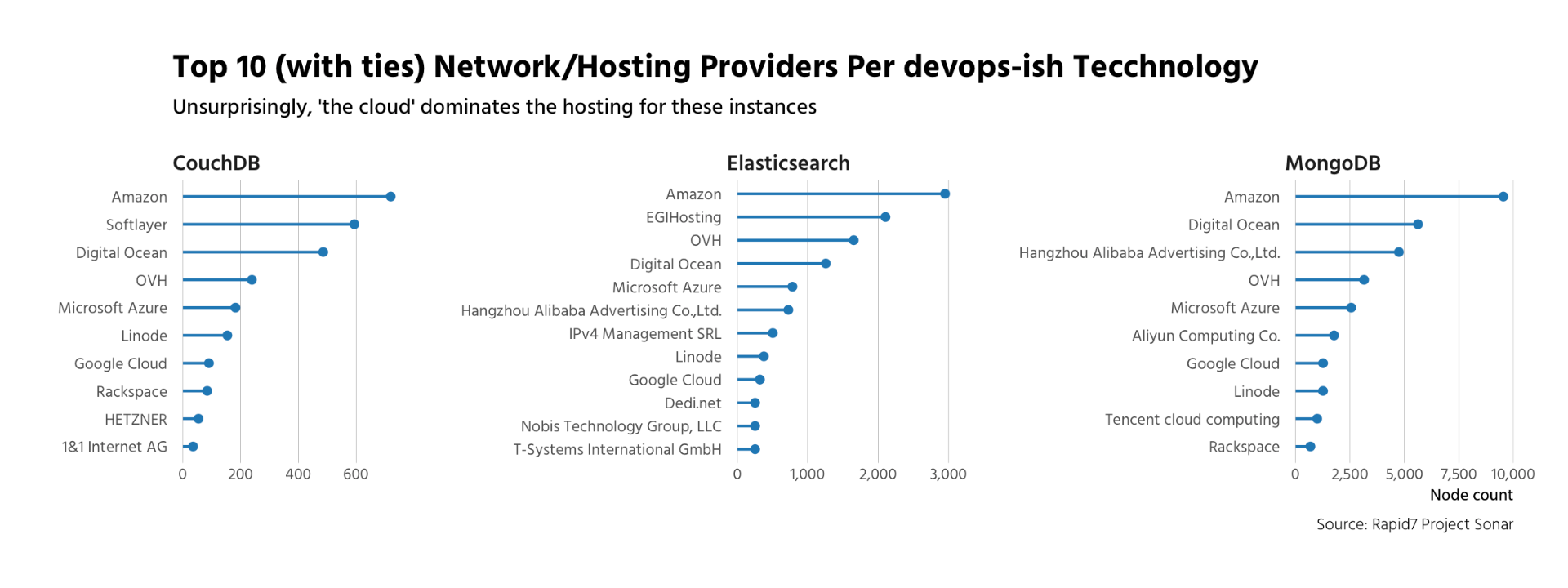 Using Project Sonar — https://opendata.rapid7.com/about/ — we surveyed the internet for these three devops databases. NOTE: we have a much larger ongoing study that includes a myriad of devops-ish and “big data” technologies but we're focusing on these three servers for this post given the timeliness of their respective attacks. We try to be good Netizens, so we have more rules in place when it comes to scanning than others do. For example, if you ask us not to scan your internet subnet, we won't. We will also never perform scans requiring credentials/authentication. Finally, we're one of the more profound telemetry gatherers which means many subnets choose to block us. I mention this, first, since many readers will be apt to compare our numbers with the results from their own scans or from other telemetry resources. Scanning the Internet is a messy bit of engineering, science and digital alchemy so there will be differences between various researchers.