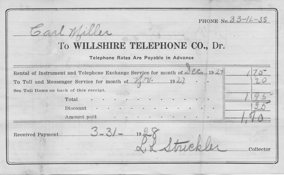 In 1915 it took 5 operators 23 minutes to make a connection between New York City and San Francisco. Today the callers connect in a second or two. The cost of that call back then was $20.70, almost $400 in today’s dollar. Today the cost of a long distance call is free, just a part of the monthly bill for your cell telephone. So, speaking of bills, let’s get back to them.