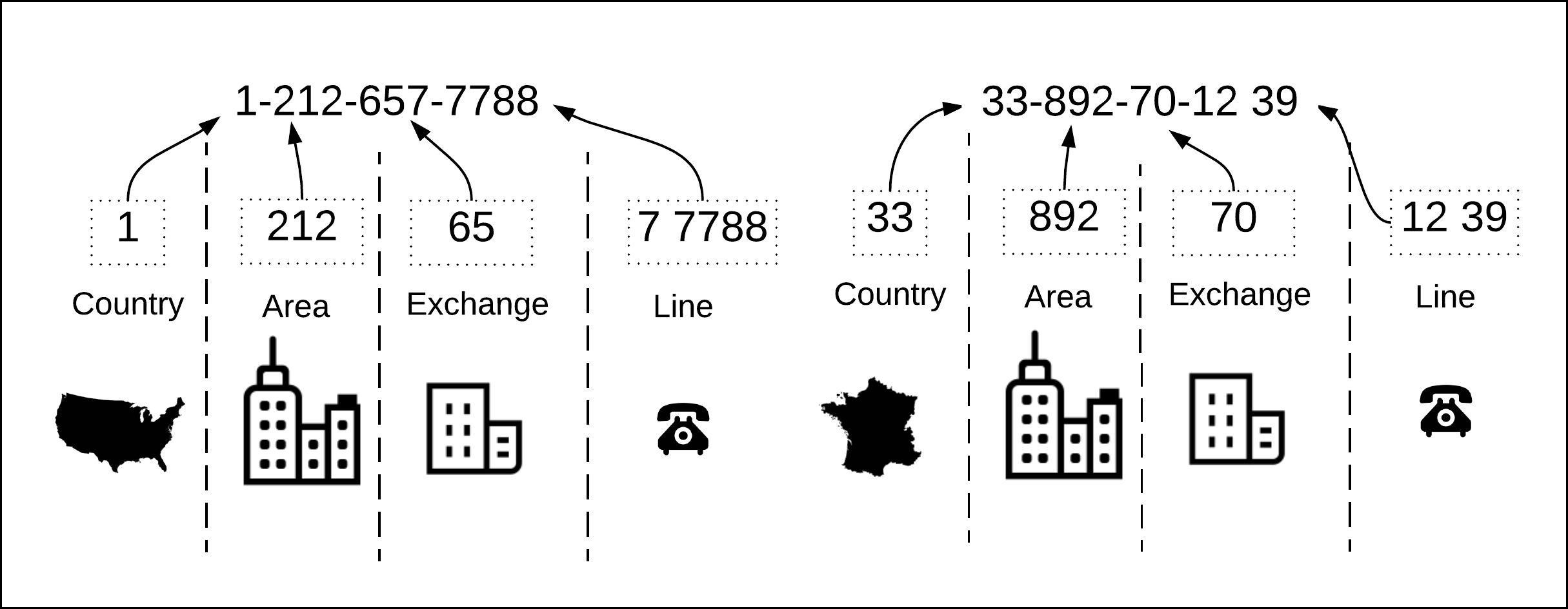 Eventually, the system was expanded to include more levels of hierarchy that could accommodate national and then international calling, as shown in Figure 4 below. National regions were identified using an ‘area code”. International regions were given a country code.