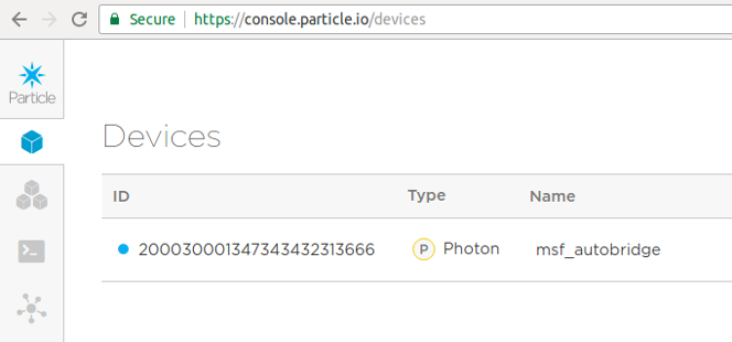 We will assume you went through the Particle.io tutorial and got the photon board registered with your WiFi and connected to your network. You should also have setup your Particle.io account during this process. Verify your device is online via the Console link on the Particle.io page. It should look similar to the below image: