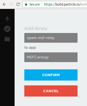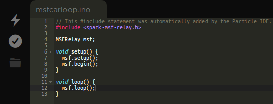 This will import the library and add an “include” in the beginning of you program. Now we will add a few lines of code. First define a global MSFRelay variable as msf. The you must use msf.begin() in the setup loop and msf.loop() in the main loop. Msf.begin() sets up the webserver and msf.loop() handles the incoming request. You may notice I've also included msf.setup(). This is optional but if you include it, the device will automatically publish the LocalIP it obtained when it connected to the WiFi to your Particle.io console.