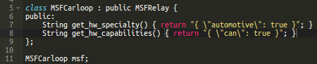 You can look at the spark-msf-relay.h for a list of overrides and look at the HWBridge API on the return syntax. To support the Automotive extension functions we will override on_request_uri. The on_request_uri method can be used to handle any request that does not come with the base relay such as specific custom hardware commands or to support additional extensions. We will use it to handle the automotive extensions.