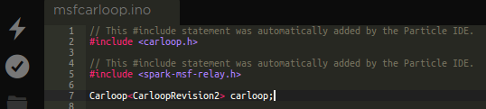 First go ahead and load the carloop library the same way you added the spark-msf-relay. It will add a header. We don't really need it for such a simple project but if you get any of the carloop accessories such as GPS, it will come in handy. You will need to create a carloop global variable like below: