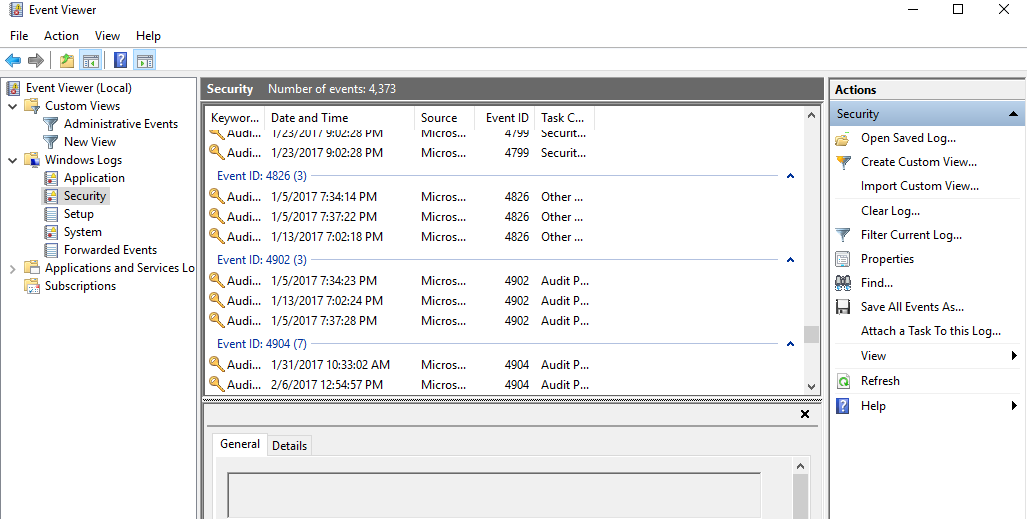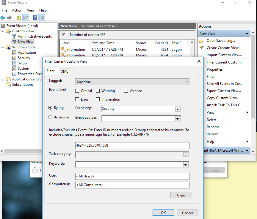 As you can see, I have created a custom filter within event viewer to only see what is important for malware detection. Understanding event IDs and what they do will help you drastically in this filtering process. Below are a few common event IDs to start with: