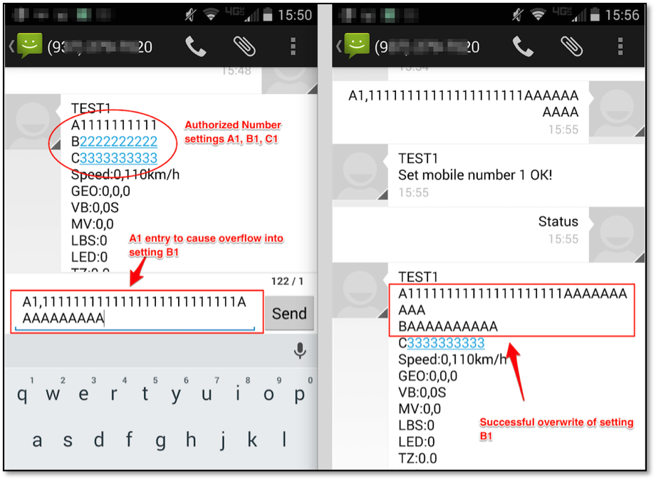 Several input configuration fields were discovered to not be performing proper bounds checks on incoming SMS messages. If a device's phone number is known to an attacker, this lack of bounds checking allows the overly long input of one configuration setting to overwrite data of another setting. An example of this is shown in Figure 3, where the "Authorized Number" setting A1 is used to overwrite setting B1: