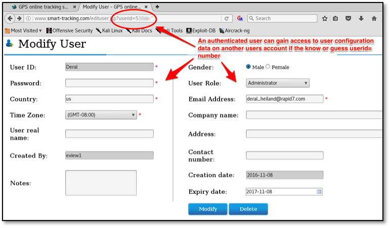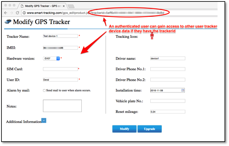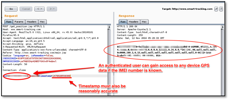 An authenticated user can gain access to others users configuration and device GPS data if they know or guess a valid userId, device IMEI or TrackerID. The following three examples (Figures 5 through 7) show this level of access from one authenticated account being able to access another account's data.