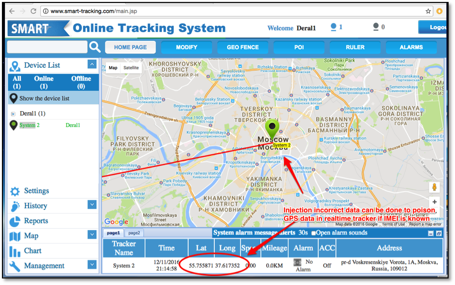 An unauthenticated attacker can poison the realtime tracking data by injecting device data similar to the data structure shown above in Figure 8 to the server at www.smart-tracking.com over TCP port 5050. The attacker can do this only if they know a device's IMEI number, but that data is learnable through mechanisms described above.