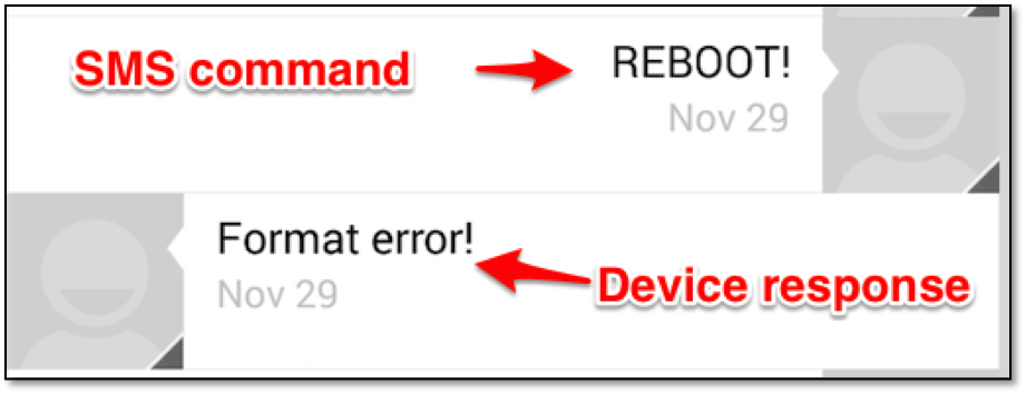 Due to providing this negative response, a malicious actor could use this command to enumerate all devices by trying all likely phone numbers, commonly known as a war dialing operation, using SMS messages containing the "REBOOT!" command.