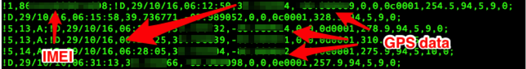 The web application used for realtime tracking web application, hosted at http://www.smart-tracking.com , does not utilize SSL/TLS encryption for HTTP services. Also the EV-07S device passes IMEI and GPS data to this website over the Internet on TCP port 5050 without any encryption. An example of this captured unencrypted data is show below in Figure 8: