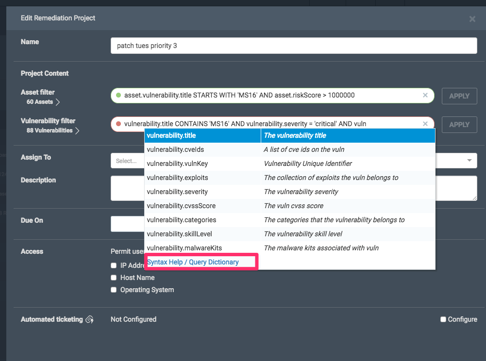 If your aim is to project manage and drive vulnerability remediation efforts, a dynamic project that is not too broad in scope is best in order to avoid solutions populating a project that are not really part of what you want to have actioned. Utilize the type-ahead behavior of the filters, as well as the Syntax Help/Query Dictionary (see below), in order to get a fuller sense of the filter criteria at your disposal.