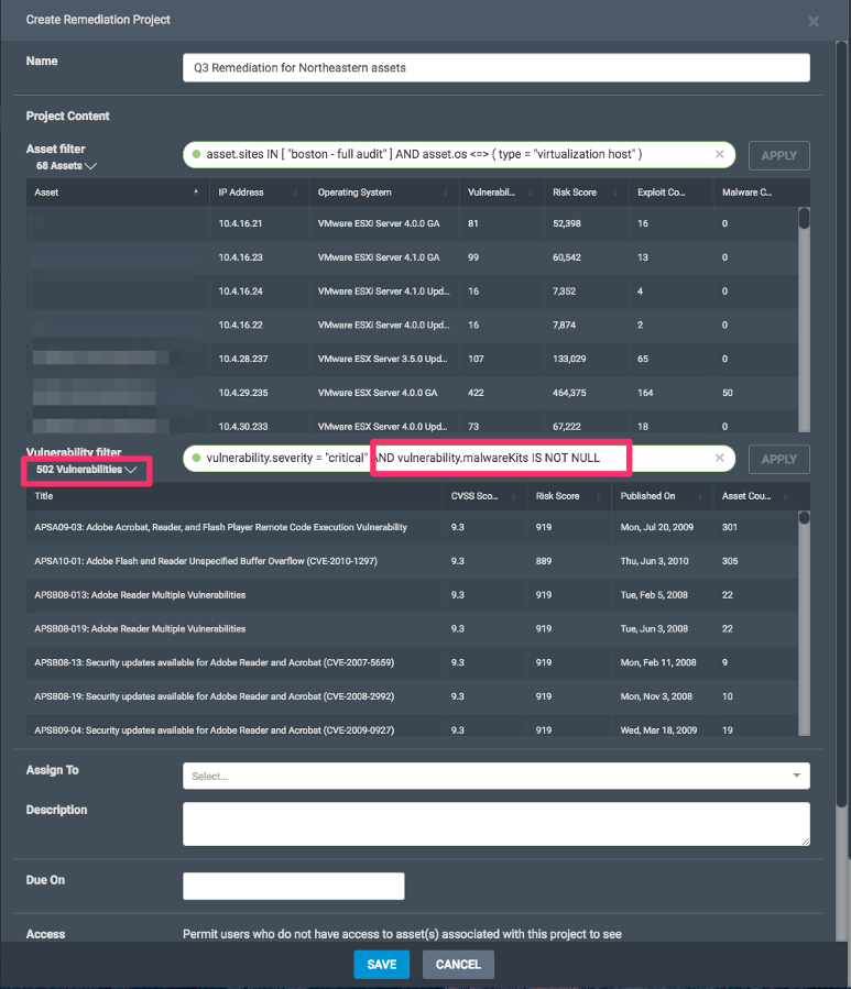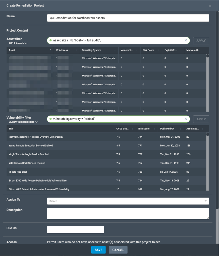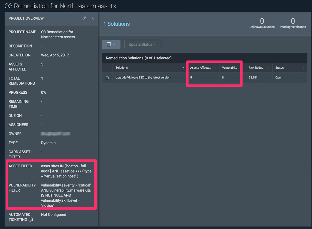 If you're seeking to drive vulnerability remediation efforts and monitor progress, then utilize the asset filters to help scope by asset ownership (owner tag or OS/Platform) and vulnerability filters to focus on remediations prioritized by risk, CVSS score, severity, category, and exploitability, etc.