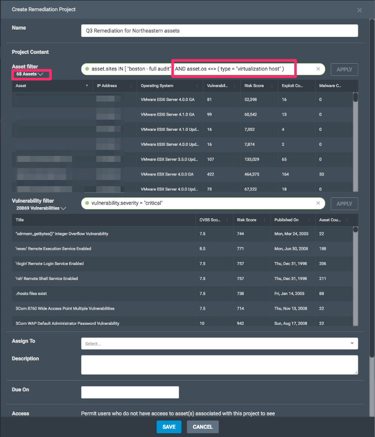 Dynamic projects provide unprecedented ways to maintain oversight on a defined set of work and enable users to pivot quickly in the event there are spikes (numerous instances of a vulnerability found or an influx of matching assets enters the network).