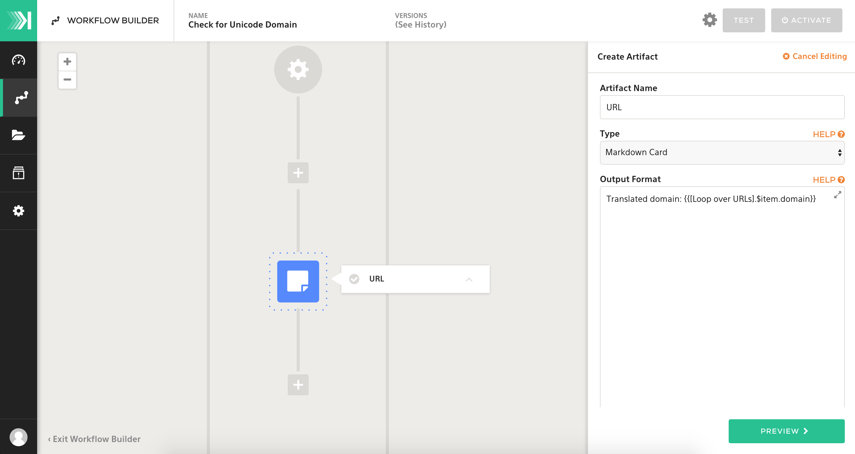 A common use case for this plugin would be during a phishing email investigation. Security teams already investigate a slew of supsicious emails and links, and with our new IDNA plugin, we can add another enrichment step to be automated. Let's take a look at what that looks like below.