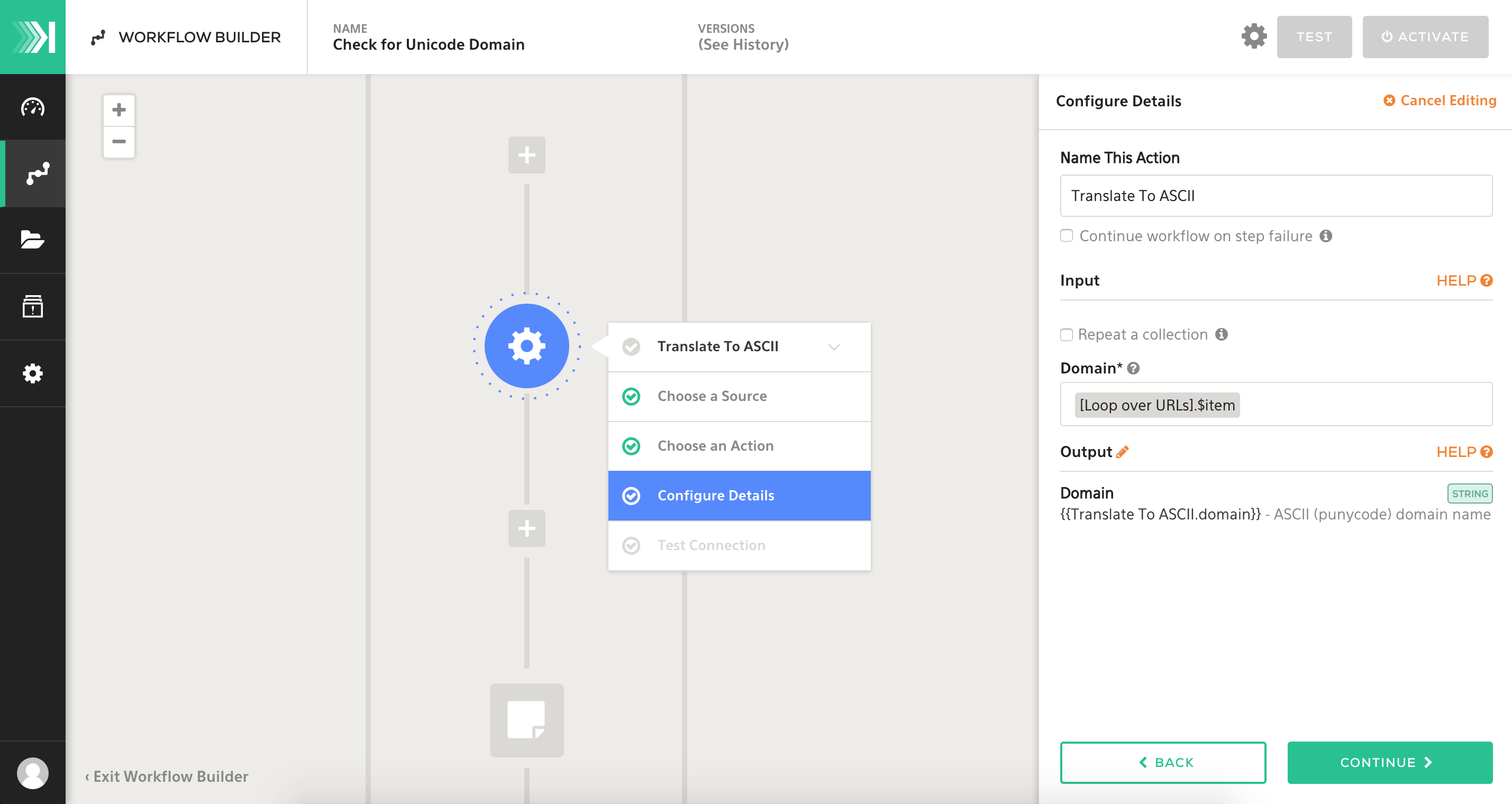 Now comes the fun part: adding the step to translate any domains to ASCII. We will select IDNA as our plugin, and we will configure input of this step using our [Loop over URLs].$item variable from the loop.
