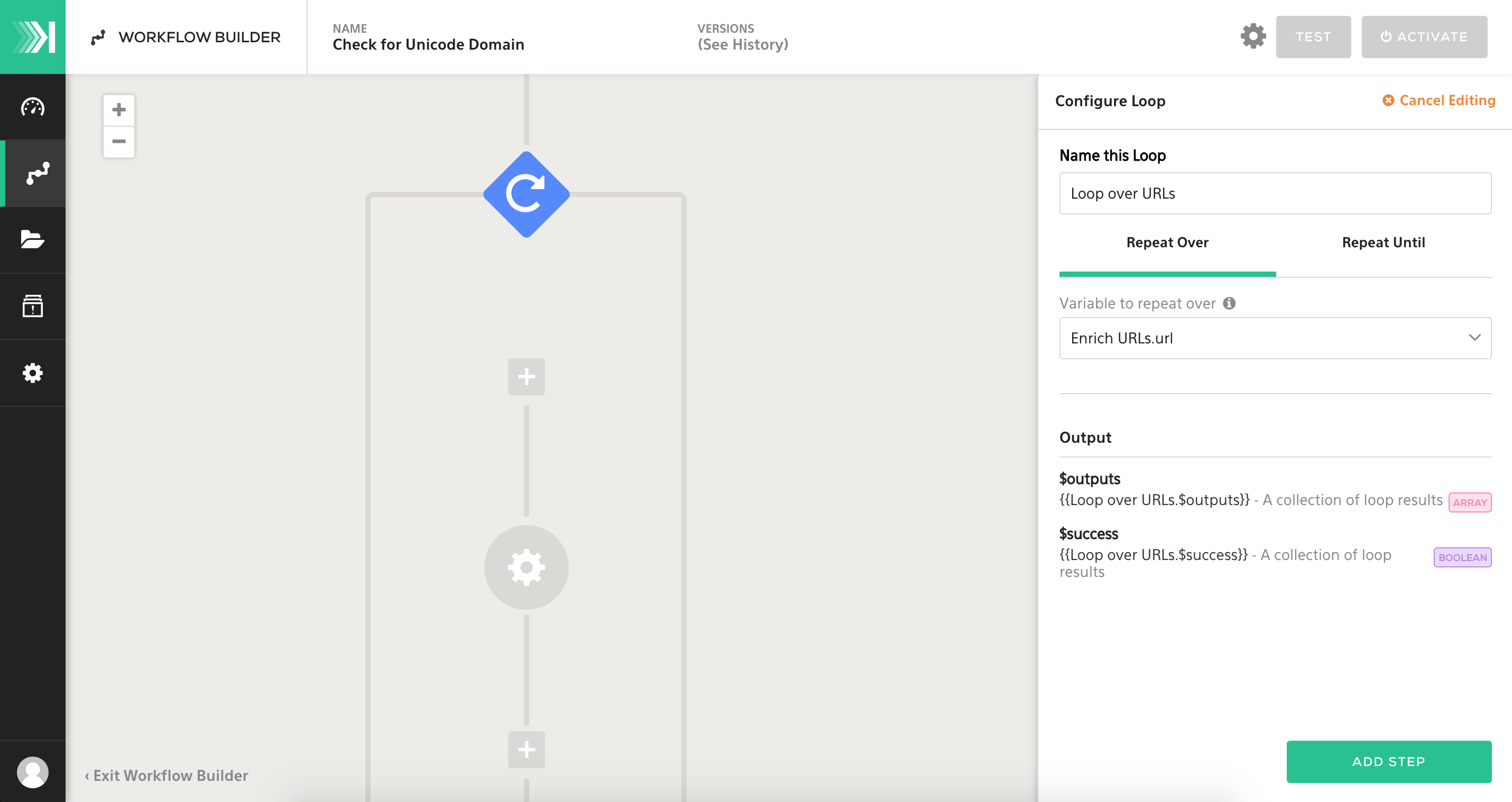 Because we will be passing over a list of domains, we'll want to create a loop to repeat over every item within the list. In this step, we select the variable Enrich URLs.urls to repeat over. This will create an $item variable to represent each individual item in the array that we'll use in our loop.