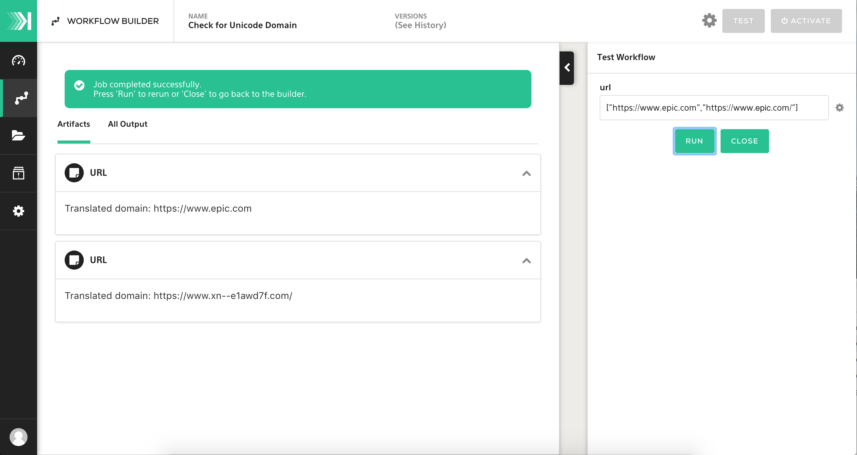 Now that we've got the enrichment step in place, and an artifact(s) in place to generate, we can move into testing. In this example, I simply used a unicode domain and an ASCII domain as test data. As you'll see below, while they visually look the same in the right panel, the artifacts on the left tell a different story.