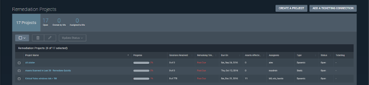 In InsightVM, you can also create a remediation project for MS17-010 to track the progress of remediation live. To do this, go to the “Projects” tab and click “Create a Project”: