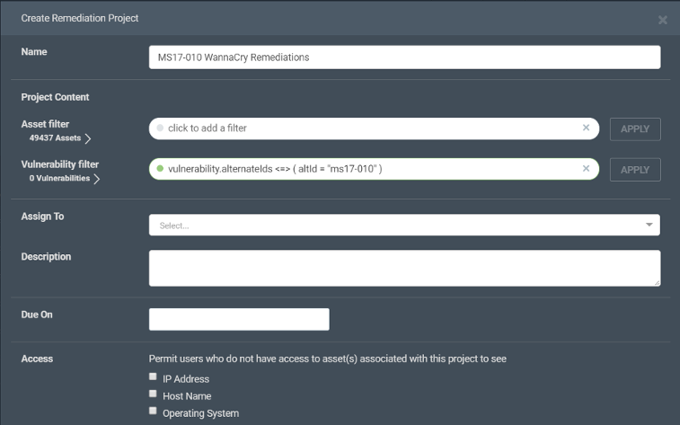 With all of the WannaCry information circulating we want to keep this simple. First, check out this link to an overview of the WannaCry ransomware vulnerability written by Bob Rudis, and then review the below steps to quickly scan for this vulnerability in your own infrastructure (if you aren't already a customer, go try out InsightVM for free you can use this free trial to scan for this vulnerability across your environment), create a dynamic asset group to continuously see affected assets, as well as create a dynamic remediation project to track the progress of remediating WannaCry.