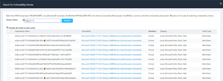 This should come back with 192 checks that are related to MS17-010. The related CVEs are: