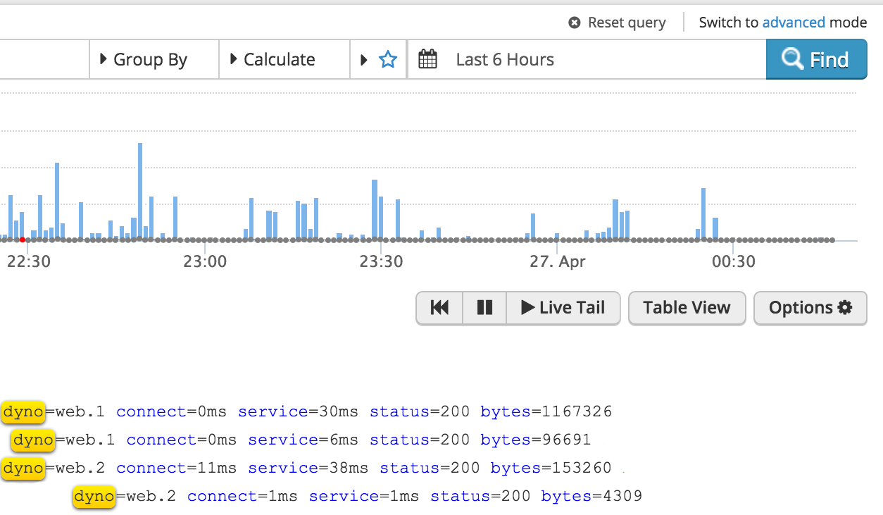 When sending Heroku logs to InsightOps, a Dyno's unique ID will automatically be logged in key-value pair format along with information about the process it handled. In the example below, we see web Dynos being identified along with the HTTP requests being handled: