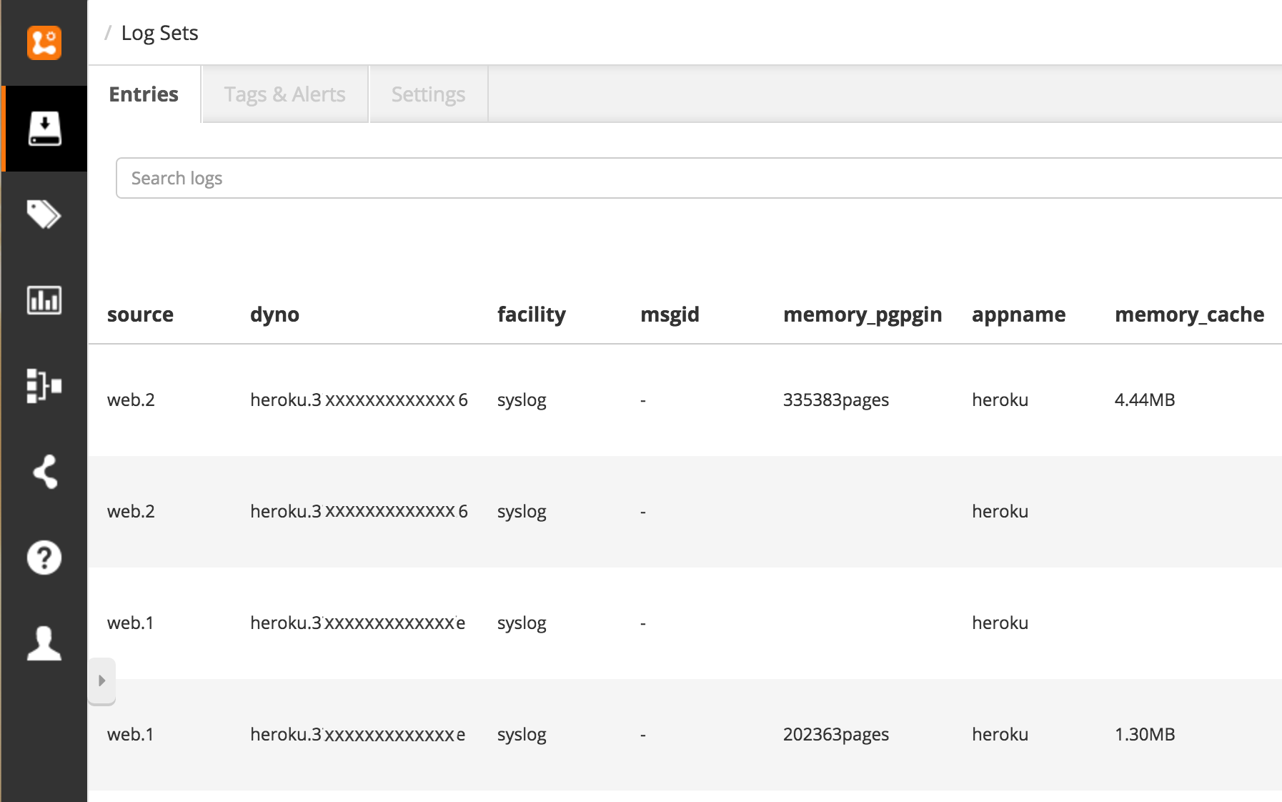 As you can see, the Heroku Dyno is easily identified along other pertinent data. Since I've enabled Heroku's beta log-runtime-metrics from Heroku Labs, I can also see data related to CPU and memory per Dyno, which is particularly useful for identifying issues like too much swap memory being used (perhaps indicating a need to scale up my Dynos).